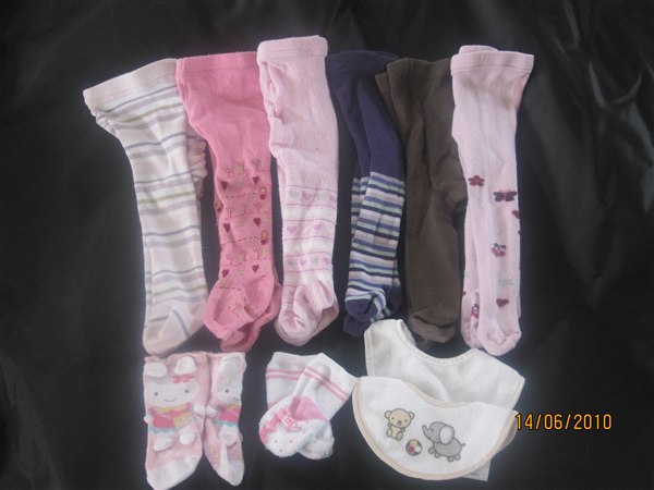 billede14: 6stk strømpebukser, 2 hagesmække, og 2 par strømper str 1-3 mdr 50kr gode men brugte, forskellige mærker
