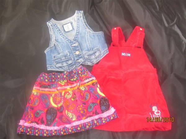 billede23: kjole str 80 disney, nederdel str 74 metoo og vest str 80 h&m. disney, aldrig brugt 30 kr pr del