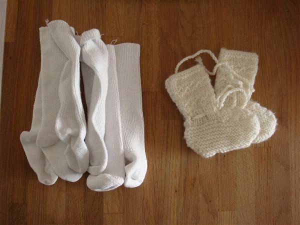 18: 3 par hvide H&M strømper (størrelse 13-15) + hjemmestrikkede futter i uld. Sælges for 30 kr.