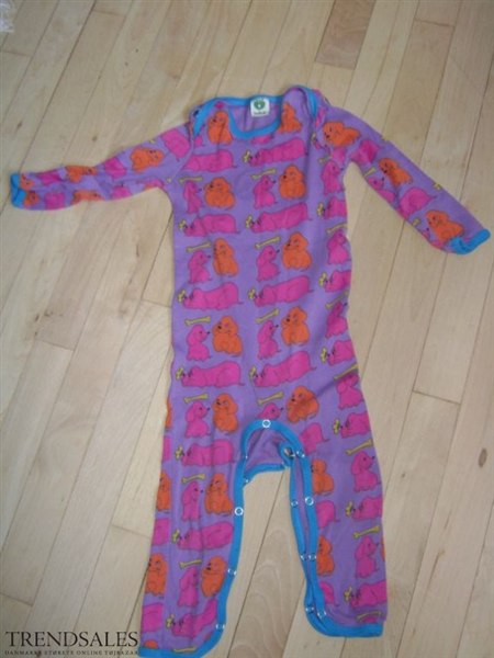 Småfolk heldragt med hunde. Størrelse 86. Der er et lille hul ved den ene trykknap men ellers fejler den intet. Sælges for 100 incl