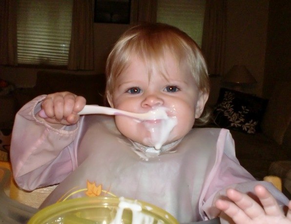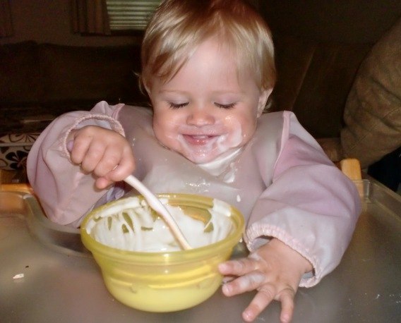 Her ses Celina, hvor hun selv styrer skeen, mens hun spiser yogurt
