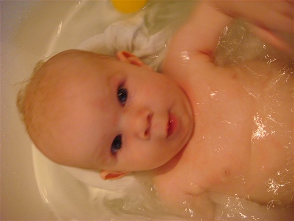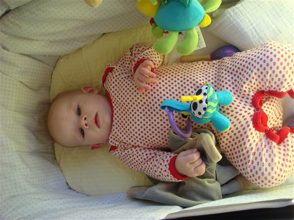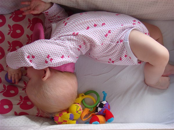 Clara har vendt sig et par gange fra mave til ryg og er så tæt på at vende sig fra ryg til mave, men numsen skal lige med