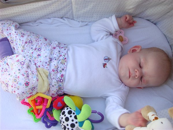 Hun sover godt om dagen, men spiser stadig 1-2 gange om natten. Vi har snakket om at putte hende på eget værelse her i weekenden, for måske hun så sover lidt bedre..