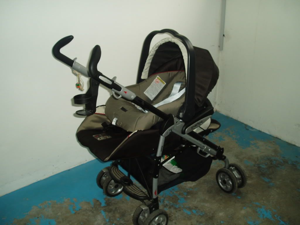 Det er en pegperego klapvogn i lysebrune farver. Dertil har vi en autostol der kan klikkes i klapvognen samt et regnslag.