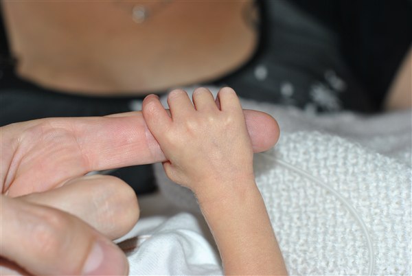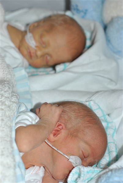 De fik gulsot et par dage efter fødslen og måtte have lidt lys, men det er de dog ovre nu, og det ser ikke ud til at de behøver tilbage i kuvøsen. Dejligt! Så de ligger i en vugge og er med os nede på vores stue i dagtimerne, men sover dog stadig på neonatal om natten.