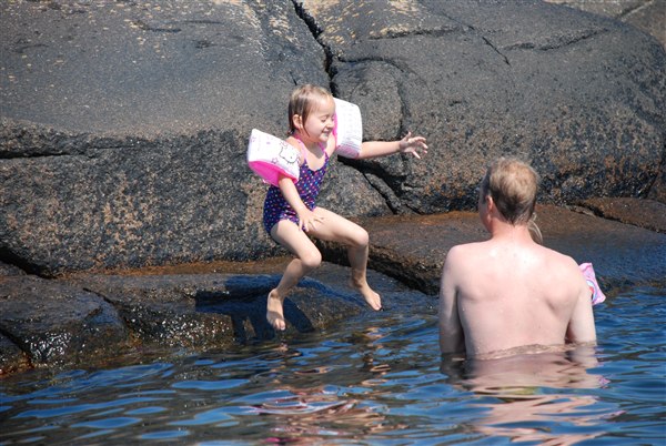 Vi besluttede at blive på Bornholm, da vejret er helt fantastisk. Vi låner svigernes hus (de er ude og sejle) Det er så varmt at vi opholder os på klipperne og bader hele dagen (dog holder vi pause fra 13-15) Det er helt fantastisk! Vi droppede vores køretur gennem sverige, det er for varmt.
