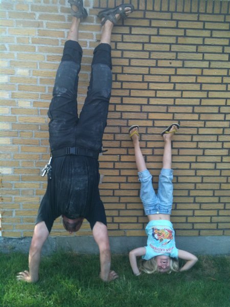 Billede 4 er Thomas og Filuca på hoved og hænder... Filuca øver sig meget i det og er faktisk ret god til det.... I det hele taget er hun ret sej til alt mulig akrobatisk Thomas er ligeså sej til det, så han øver meget med hende.... Hun sjipper baglæns, dobbelt, slår saltoer på trampolinen, fræser afsted på rulleskøjter, slår vejrmøller, står på hoved og hænder- og det er absolut IKKE fra mig hun har alt det!!!! Vil sgu ikke ligefrem kalde mig selv akrobatisk, ha ha