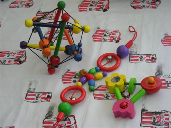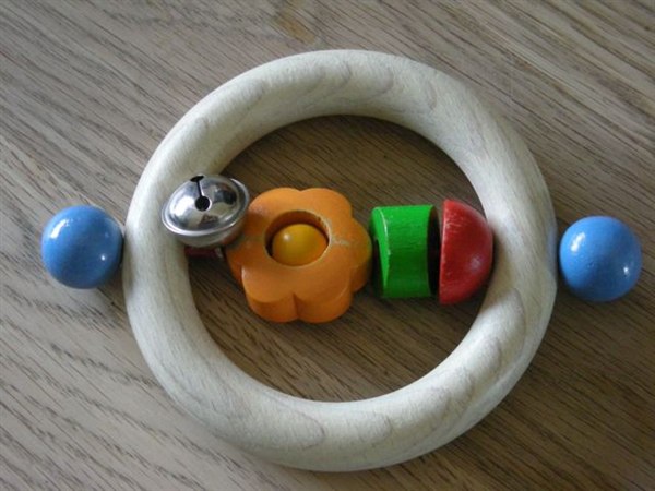 Billede 9. Træ-legetøj, med barnevognsrangle med klokker, SKWISH-aktivitets-rangle og næsten ubrugt trekant-rangle fra Haba. Samlet 100 kr.