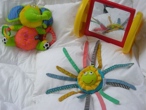 Billede 8. Rullespejl og musik-elefant fra Playgro. Mærke-hænge-dims med spejl på bagsiden. Samlet 40 kr. (Solgt)