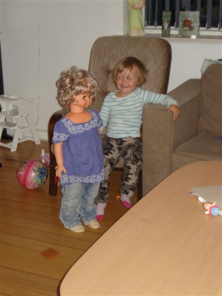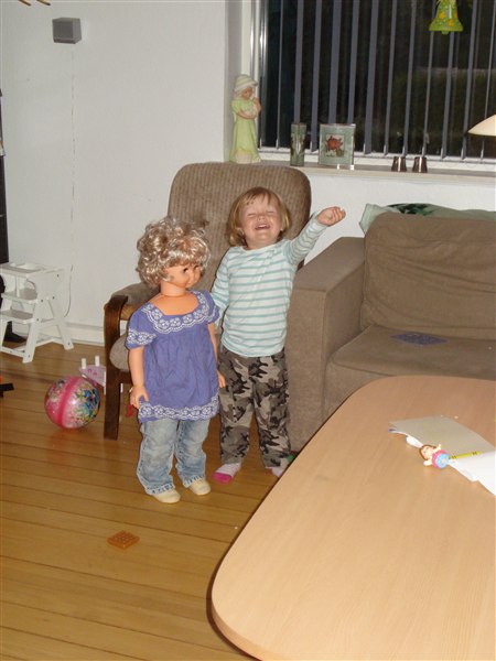 Og endelig 2 stk af Laura og hendes lille dukke... tøjet dukken har på er noget af Laura's bukserne gik i stykker da trykknappen røg ud... og "trøjen" er en kjole der er for lille... men ellers samme størrelse som Laura bruger nu...