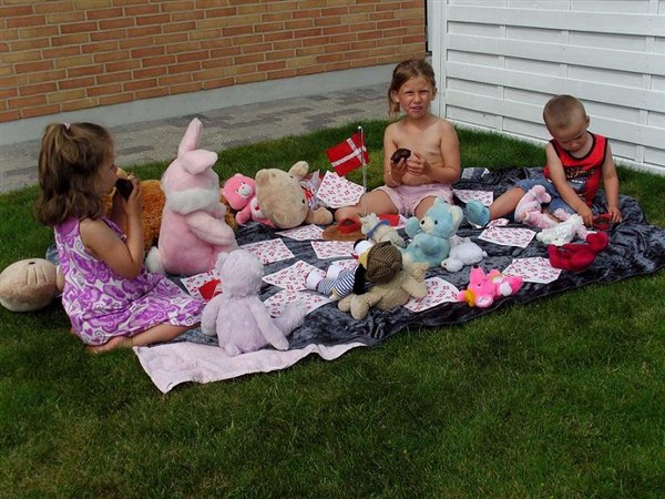 Så vi endte med at bruge formiddagen på at lave indbydelser (til alle de andre bamser) og handle ind. Mens Noah sov til middag, bagte jeg og tøserne hjerte-chokolade-muffins, og da han vågnede dækkede vi op ude på græsplænen med dug, flag, krus og servietter. Så blev der placeret sådan cirka 20 bamser på dugen, og vi fik lidt plads til os selv, fandt rød sodavand og kage, og så var vi klar :-)