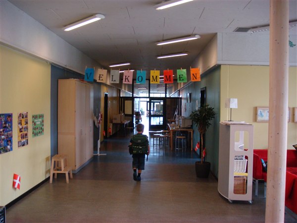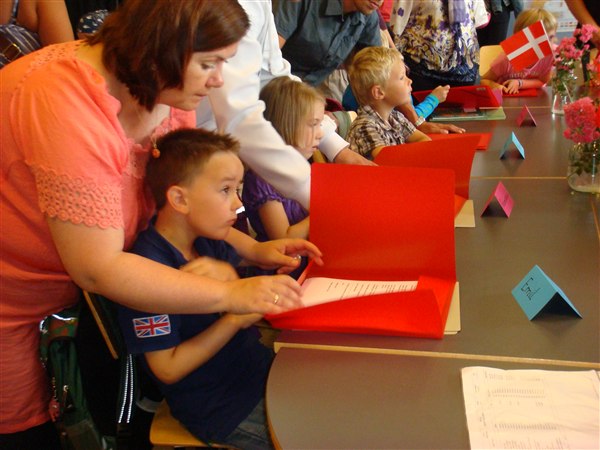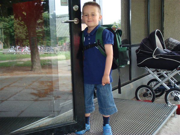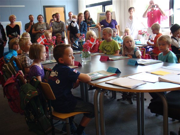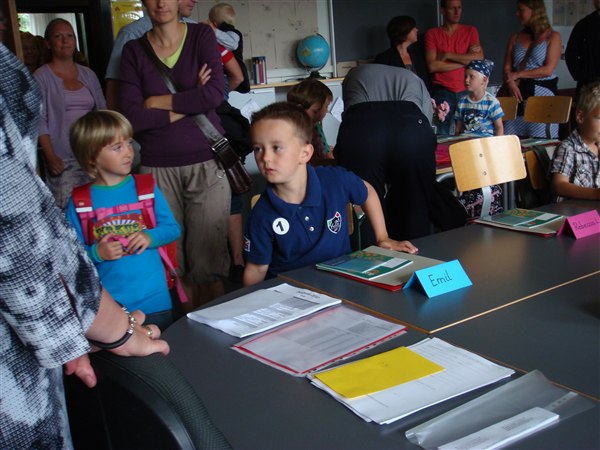 Vi hilste på et par stykker fra Bhv. og gik ned i klassen hvor vi hængte tasken vi skulle mødes til fælles velkomst i aulaen hvor inspektøren bød velkommen og så blev de sendt på klasserne hvor der var lidt generel info og så blev forældrene sendt ud