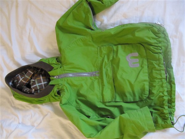 Piva skriver: Så fed anorak fra Minymo. Den er brugt meget få gange. Den er grøn med brunt foer. Desværre er der gået lidt af "M" foran på jakken under den eneste gang, den er blevet vasket. Bydbydbyd