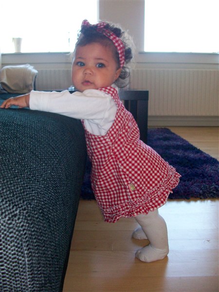 Han kan sidde selv og kunne det i ca 1½ mdr nu siger mange små ord småt som dada.mama.mere tydelig ord som hej.vuv og i weekenden sagde vi far flere gange og til sidste eller nu kan han både sig far og mor næsten rent. han kan næsten kravle han møver rundt prøver virkelig kommer også rundt i af møve sig frem til siden også i gårvogne men vi lader ham ikke sidde i den for langtid har hørt det ikke er så sundt for deres hofter især osv.