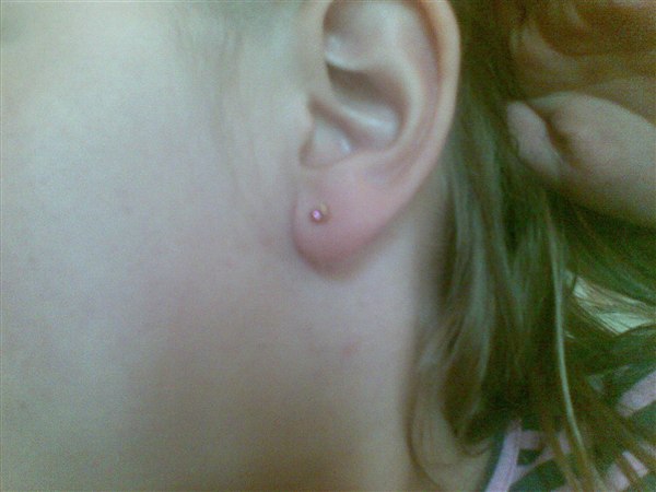 Så kom vi tilbage, så blev hun bange for pistolen men fik så lov til at holde og se den selv. Da første hul var skudt i skreg hun godt nok, og ville ikke have lavet hul nr. 2. Jeg sagde så til hende, at vi jo havde aftalt at gennemføre efter første hul!! Vi kiggede lidt på det første hul med den fine ørering, og så lovede jeg hende en is hvis vi tog det sidste nu og her! Ok .. sagde hun så. Op på stolen, og så holdt hun mor i hånden, og så skreg hun igen fordi hun mente det gjorte mere ondt end første hul. ;-) Lige efter skreg hun MOR du skal kramme mig hårdt, det gjorte vi så;-) Efter 5 min var hun super glad for dem, og idag har hun været SÅ stolt i skolen;-))