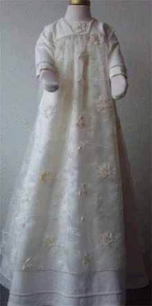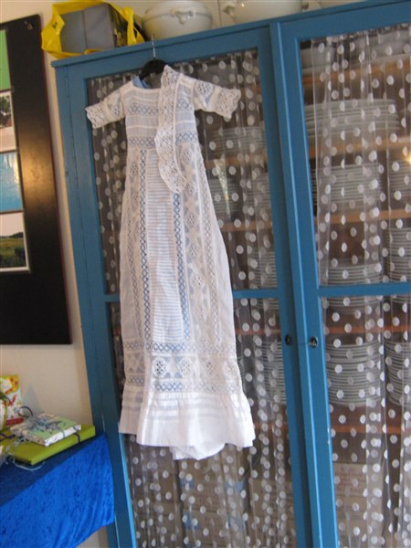 Her er Andrea's dåbskjole. Vi havde en familiedåbskjole, som har været brugt siden vores bedsteforældre, men den forsvandt desværre efter vores kusine blev døbt i den ØVØV, så min søster fik lavet denne. Det er meningen den skal gå i arv fra nu af.