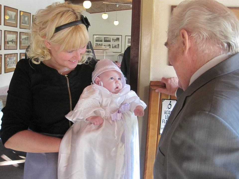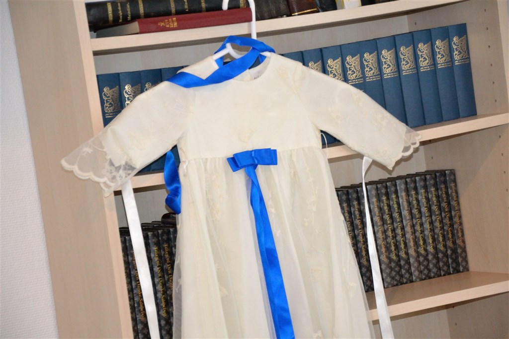 Freja er døbt i sin fars kjole som er syet af Panayotis i Vejle den er 32 år gammel