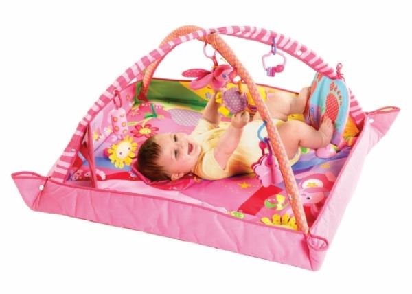 Gymini Tiny Princess stort legetæppe fra Tiny Lone i pigefarver med kanter der kan foldes op. Derudover er der spændende sparkeplade, spejl og rigtig mange vedhæng med forskellige aktiviteter til barnet. Bøjlerne er aftagelige og tæppet kan vaskes i maskinen.