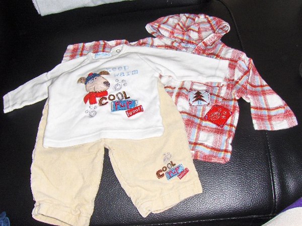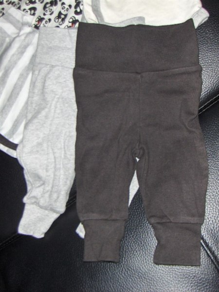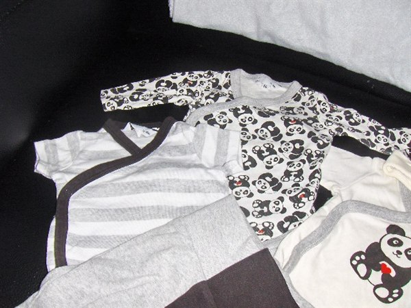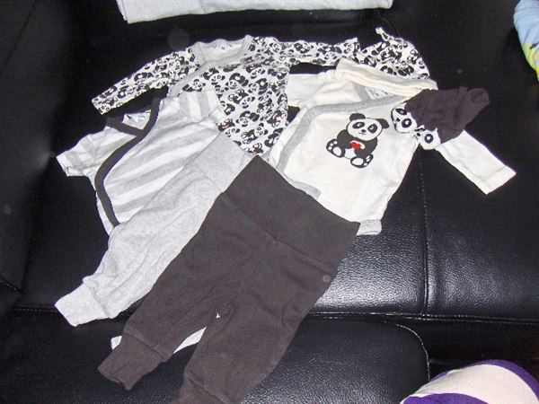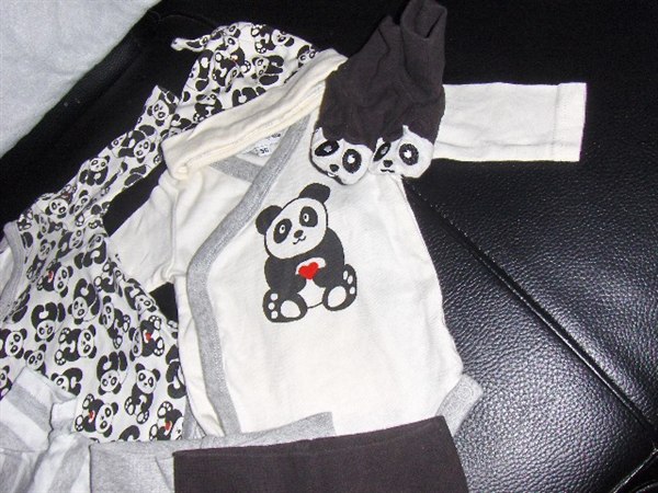 Billed 23+24+25+26 - Ellos babysæt, består af 2 L/Æ body, 1 K/Æ body, 2 par bukser, 1 hue, 1 par futter - Der er kun den L/Æ body med mange pandaer+sorte bukser der er brugt mere end et par gange. str 56 - Pris hele sættet 125 kr