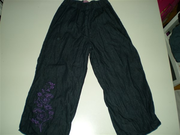 8. Ballonbukser i demin med lilla broderi, str 122. 50 kr.