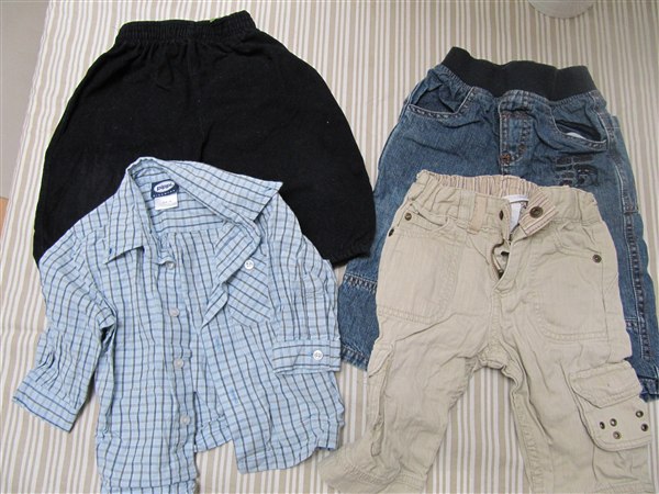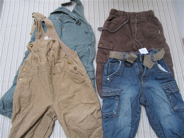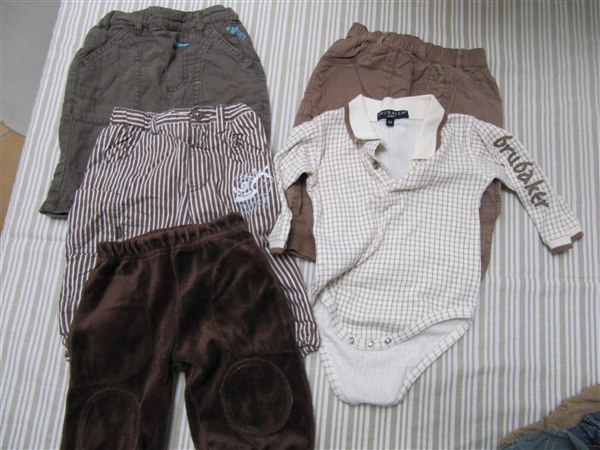 Grønbrun buks fra Esprit, Stribet buks fra Name it, Brun velourbuks fra little one, Bukser + body fra Brubaker