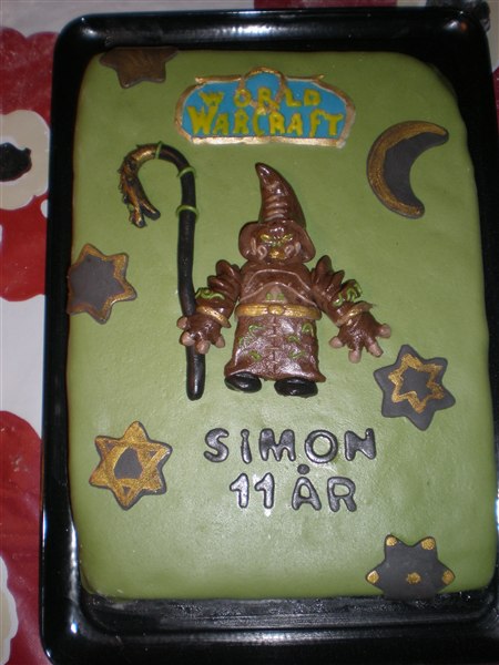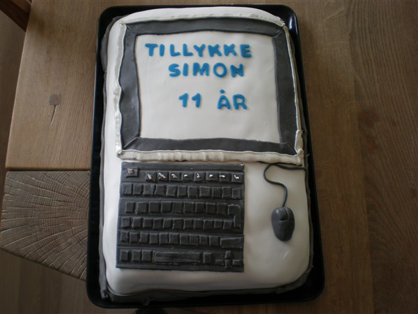 Simon havde ønsket sig 2 ting til sine kager. For det første Blomsterbergs bryllupskage, så det er hvad der er indeni computerkagen og dernæst ville han gerne prale nede i skolen med at hans mor kan lave en WOW-kage. Så det blev det jo så til med den anden. I den er der bare en banankage.