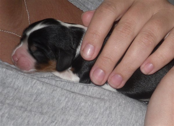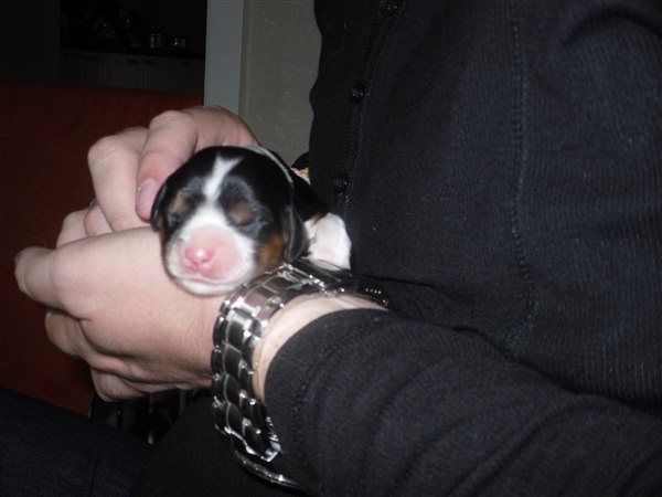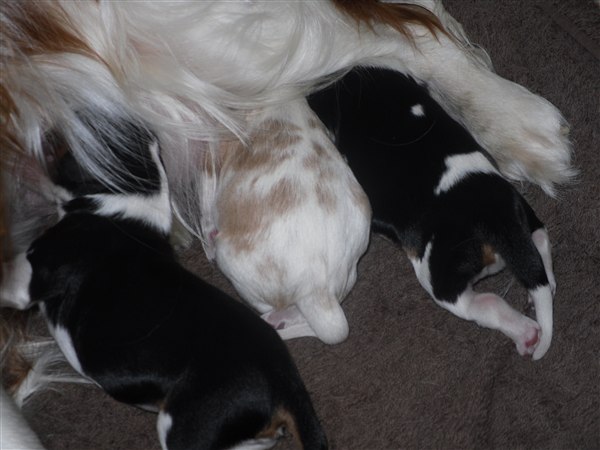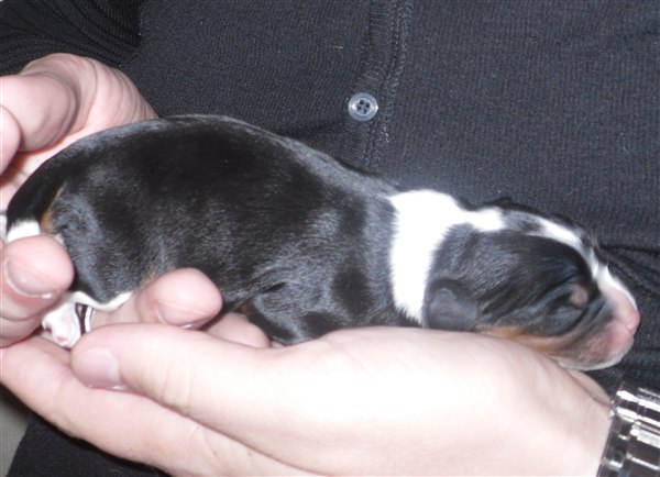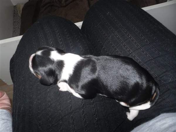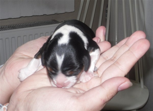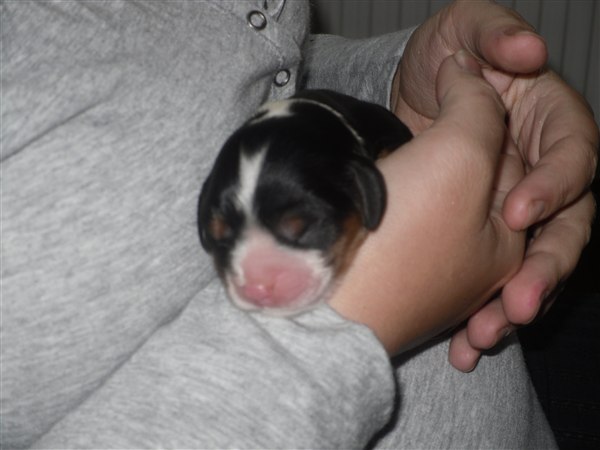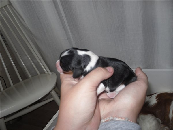 Og det blev en tricolor. Og hun har de smukkeste tegninger, og er helt sort på ryggen. Og den yderste halvdel af hendes hale er hvid