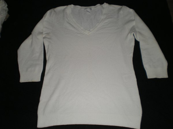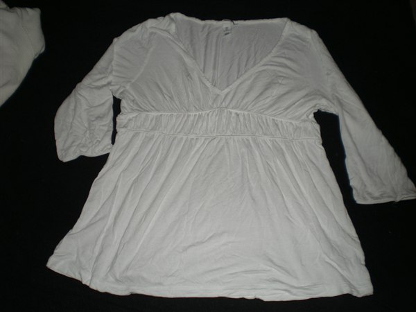 Billede 2 er en hvid bluse med halv lange ærmer med elastik under brystet som giver en pæn pasform. Størrelse L.