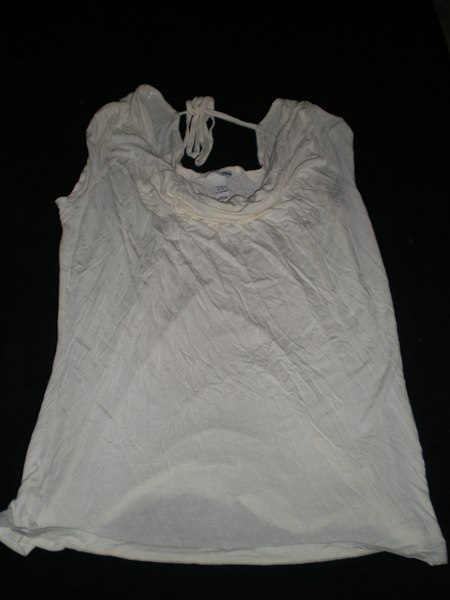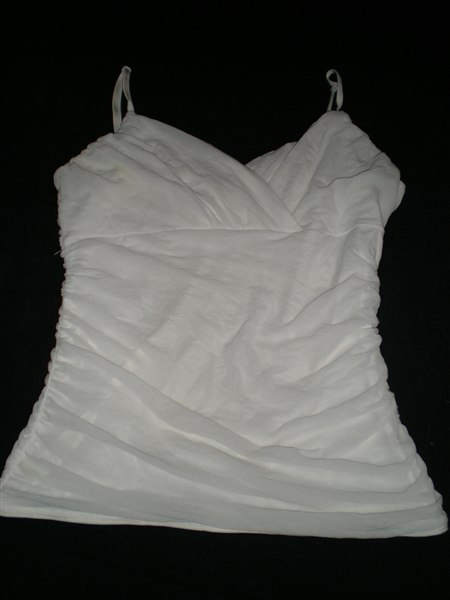 Billede 5. Sød hvid top i størrelse 40-42, hvor der er sådan noget sødt gennemsigtigt stof udenpå toppen, og samlingerne i siden gør den lidt unik. (Billede 6)