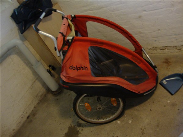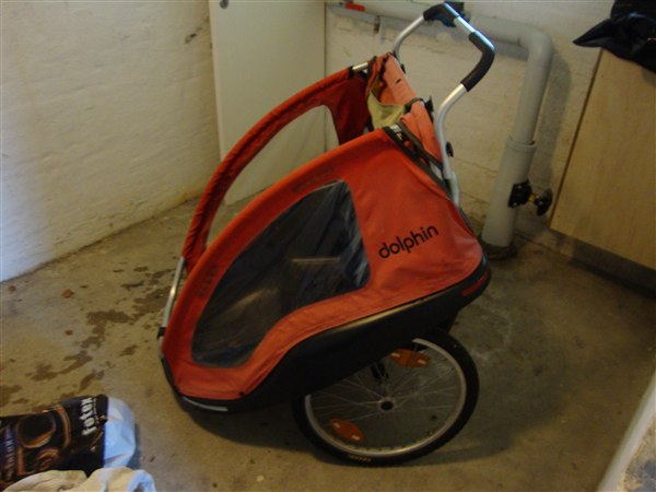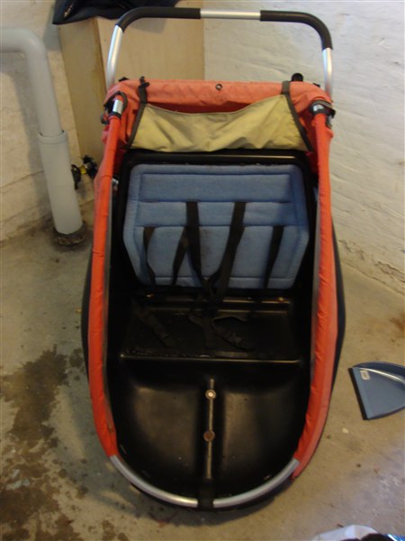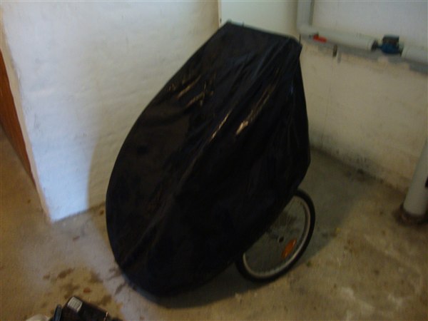 Der medfølger lille hjul så man selv kan gå med den + anhængertræk så den kan sættes på cyklen. Udover dette medfølger der regnslag/beskyttelsesslag(mørkeblå) som er i hel stand, dog misfarvet pga. solen.