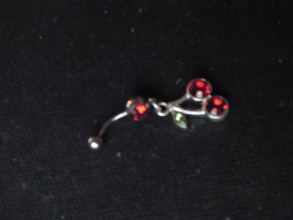 billede 5: stål kugle med rød "diamant" kerne. vedhæng: klassisk dobbelt kirsebær i rød "diamant" og én grønt "diamant" blad