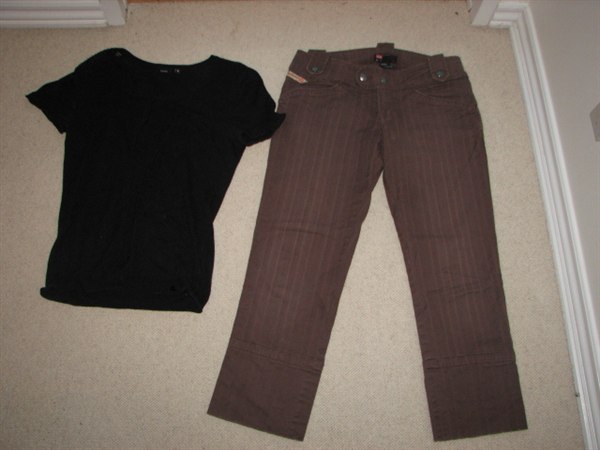 Standen på tøjet er nyt, næsten som nyt eller god men brugt. Og langt det meste er str M, ellers nogenlunde svarende dertil - bukserne hedder mest 29 og 30 i livet og ca. 32 i lænden - dog er der også trekvarte i mellem - der kan dog også forekomme en smule i S og L. Mærker er bl.a. diesel, Lipo lipo, Green house, vero moda, Signal, Esprit, Part two osv.
