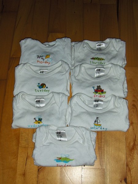 9. H&M bodys 7 stk. ugens dage - 62 - brugt men pæne (små pletter på 2 af dem, har ingen betydning når de er på)