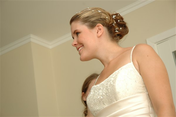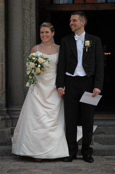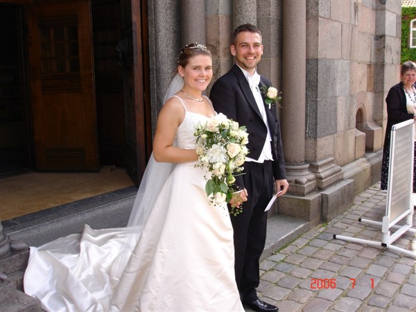 Den er str. 36, fra Panayotis i Vejle, nypris 12.000 kr. Farven er elfenben, den er i fed silke, har underskørt til, og fine små perler i toppen og på stropperne.