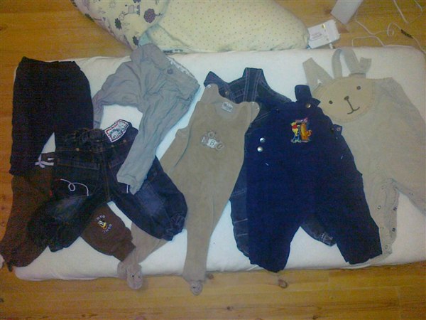 Der er 2 joggingbukser, 1 par minymo-jeans, 1 par fine bukser, 1 sparkedragt, 3 smækbukser