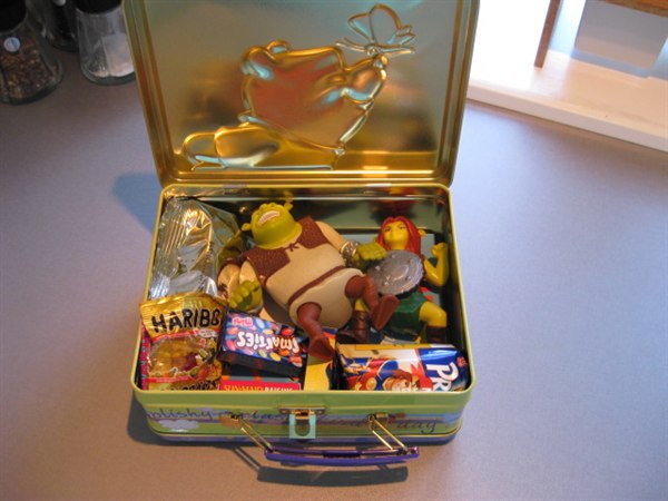 Til flyverturen havde jeg lavet en lille "surprise"-kuffert til ham, med bøger (bl.a. en billedbog, med egne billeder af ting han kender hjemmefra), legetøj, rosiner, kiks og slik, så der var lidt at underholde ham med