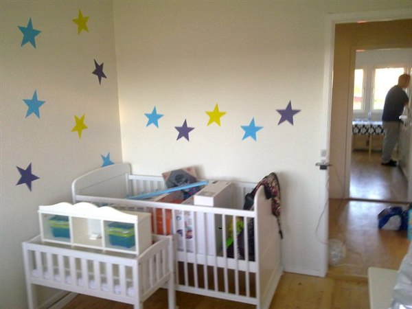 vores tema er stjerner, så vi har fået lavet de vægge færdige der skulle gøres noget ved, vi har selv malet en masse stjerner, det blev så fint.