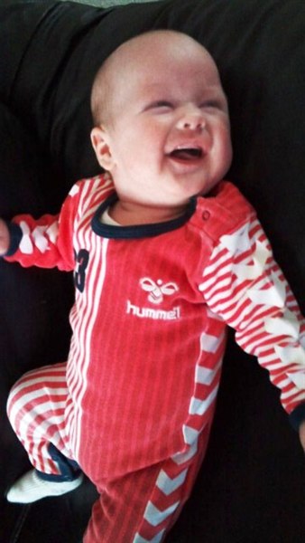 Så røg Alvin i spillertrøjen. Det holdt i en times tid, så tissede han igennem, fik skiftet tøj og sover nu.. Tanken om at hygge med morfar til en fodboldkamp var god nok.