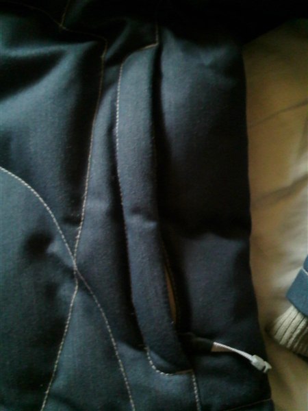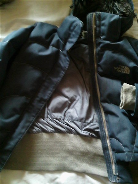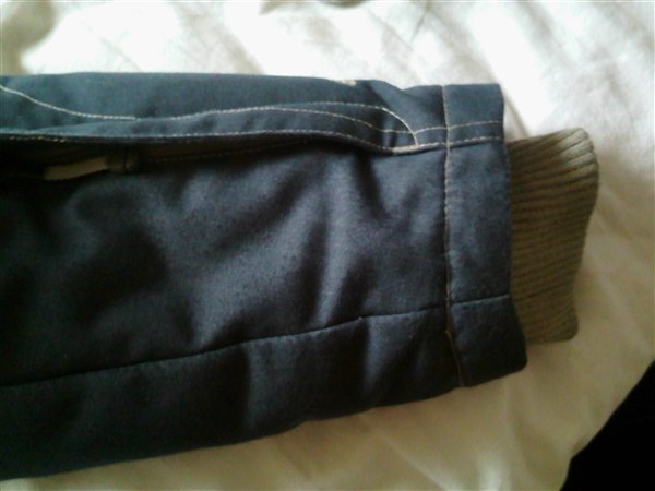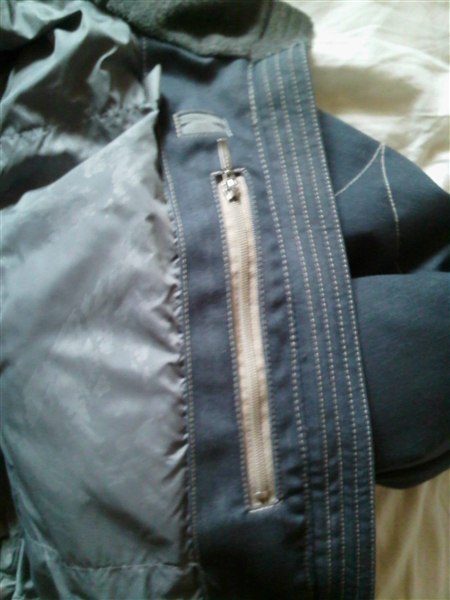 Den fejler absolut intet. Skal nok lige vaskes, d den har lagt i en pose på loftet, sommeren over. Den er blålig/grå i farven, har utallige lommer rundt omkring, bl.a. på ærmet. Er desuden vandtæt og vindtæt og har aftagelig hætte.