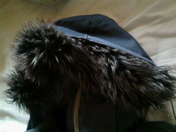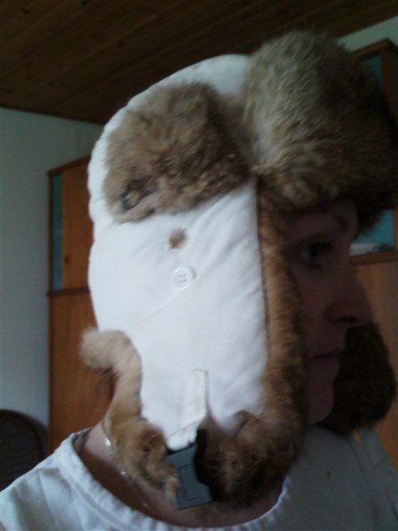 Den er hvid med, som sagt, kaninpels. Kan lukkes omkring ørerne, men også lukkes ovenpå hovedet. Nypris; 199 kr. Sælger også denne for det halve; 100 kr.