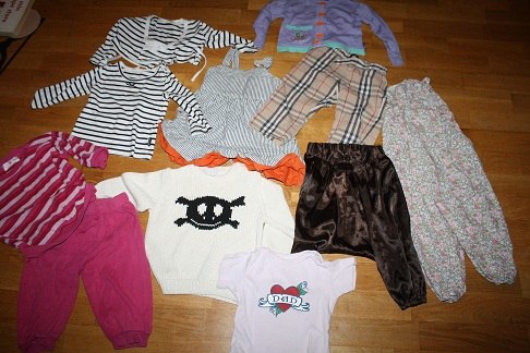 Jeg har de brune harems bukser, Burberry bukserne, det pinke nattøj og de pinke uld gamacher i str 80. Så ahr jeg også et par Molo jeans med stjerne hvis det er