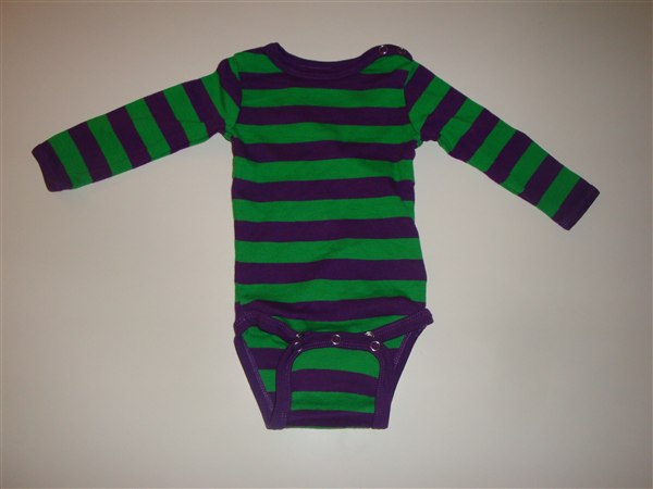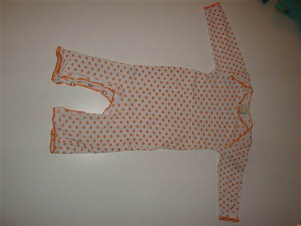Billede 5: Heldragt med orange kløvere fra Holly's. Str. 68, men lille og nærmere svarende til 62. Standen er god men brugt. Ingen huller, pletter eller lignende men det kan ses den har været brugt.