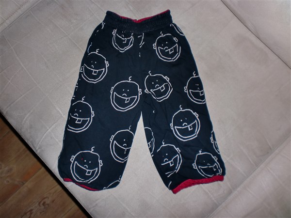 Røde fløjlsbukser med mørkeblå foer og smile-ansigter på indersiden (jeg tror faktisk man selv kan vælge, hvordan de skal vende).