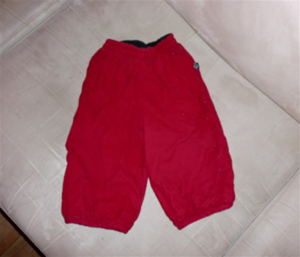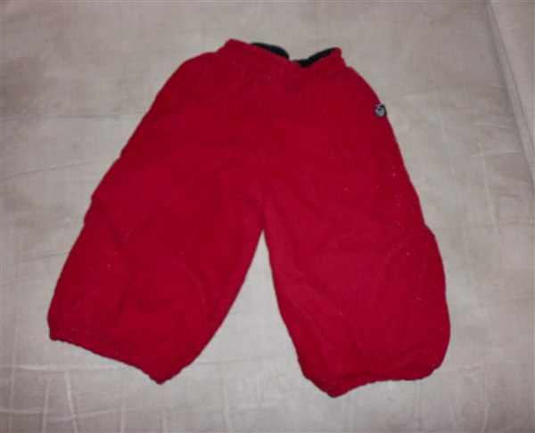 JustAnotherName skriver: Røde fløjlsbukser med mørkeblå foer og smile-ansigter på indersiden (jeg tror faktisk man selv kan vælge, hvordan de skal vende). Pris = 40 kr. pp