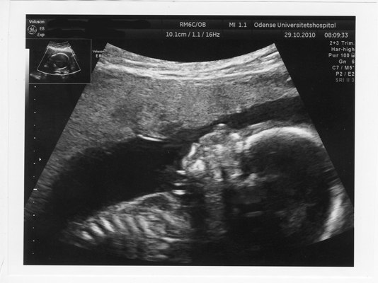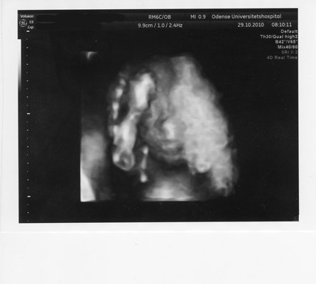 Men desværre kunne hun ikke se kønnet sagde hun, for hver gang hun var lige ved og næsten kunne se det så vendte den lille røver sig om så vi kun kunne se en røv eller ryggen. Nå sagde jeg så, jamen så skulle vi nok bare ikke vide det, så er det bare en hemmelighed. Så skulle hun til at pakke væk, men.... så tog hun lige scanneren på igen - ej jeg kigger lige en gang mere sagde hun... uh sagde jeg tror måske at hvis jeg umiddelbart skal give et bud så skal i have en lille pige.