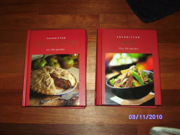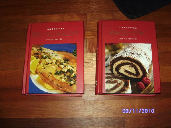 Sprængt and , bankekød , brændenældesuppe , cheesecake , citronfromage , dampet torsk , honningkage , fiskefrikadeller , grøn salat med flødedressing , hønskesalat , jordbærsyltetøj , kalvebrisler , labskovs , marmorkage , nakkekam , omelletter , pandekager , rødgrød , saltede citroner , tykmælk , valnøddesnaps , wienershnitzel , æblekage ..