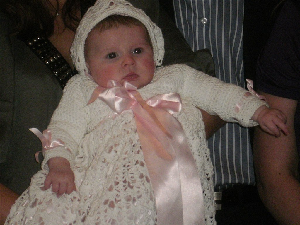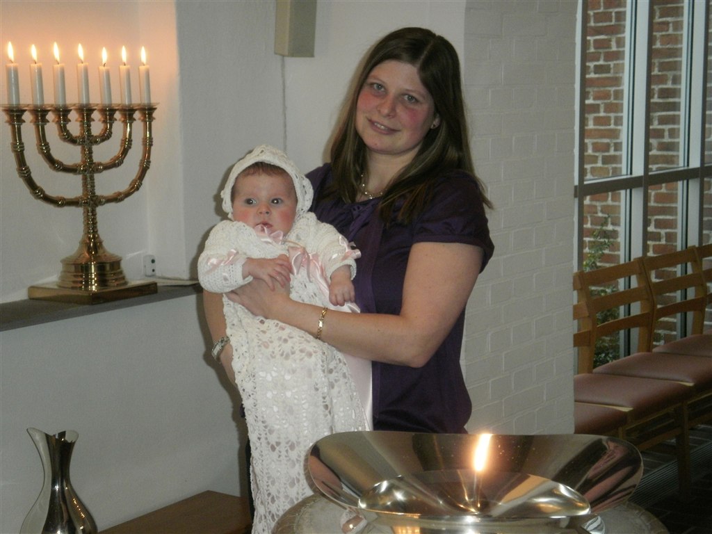 Her er Laura i hjemmehæklet dåbskjole, som er hæklet af hendes reservebedstemor - min bedste veninde Signes mor. Signe er selv døbt i den.