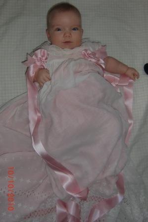 her er merle i hendes dåbskjole, som er lavet af min mosters konfirmationskjole, og som både mig og min bror er døbt i.