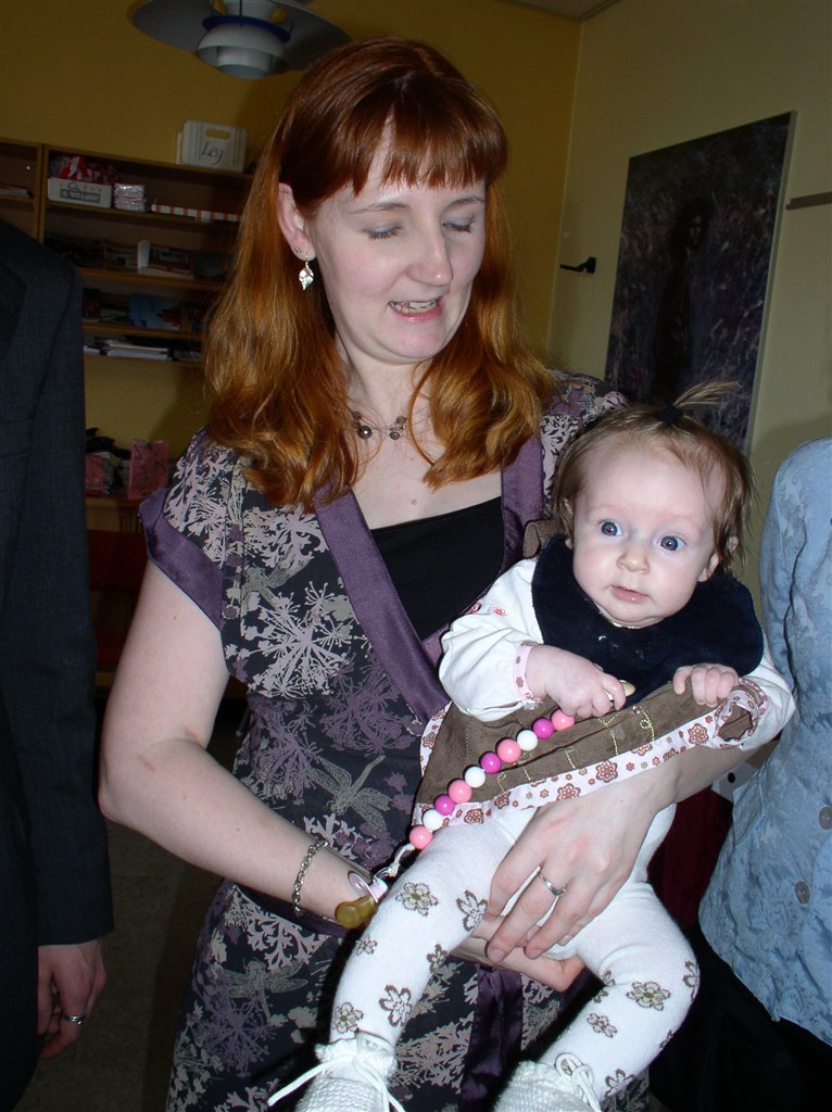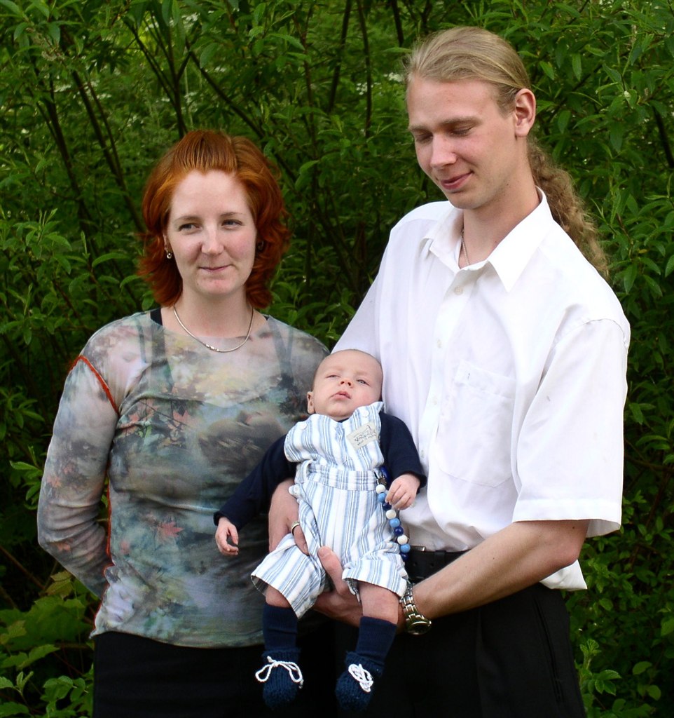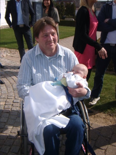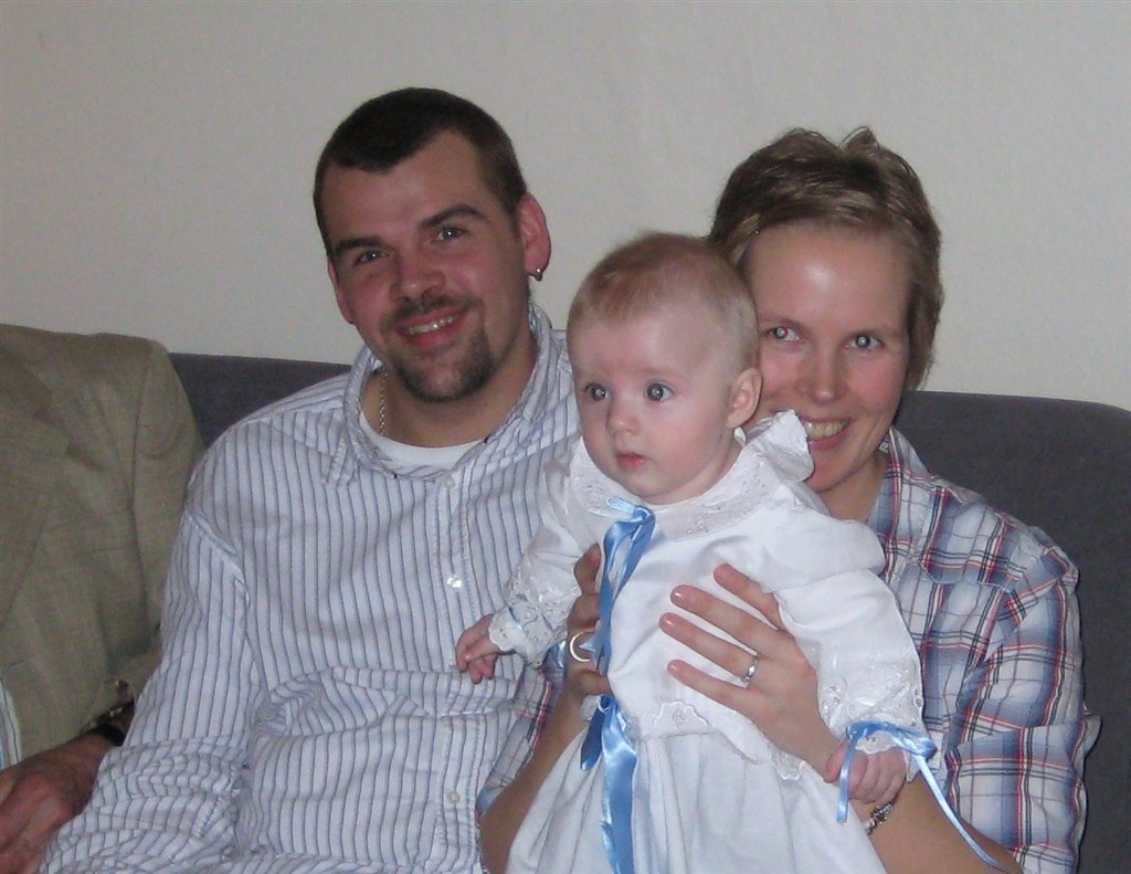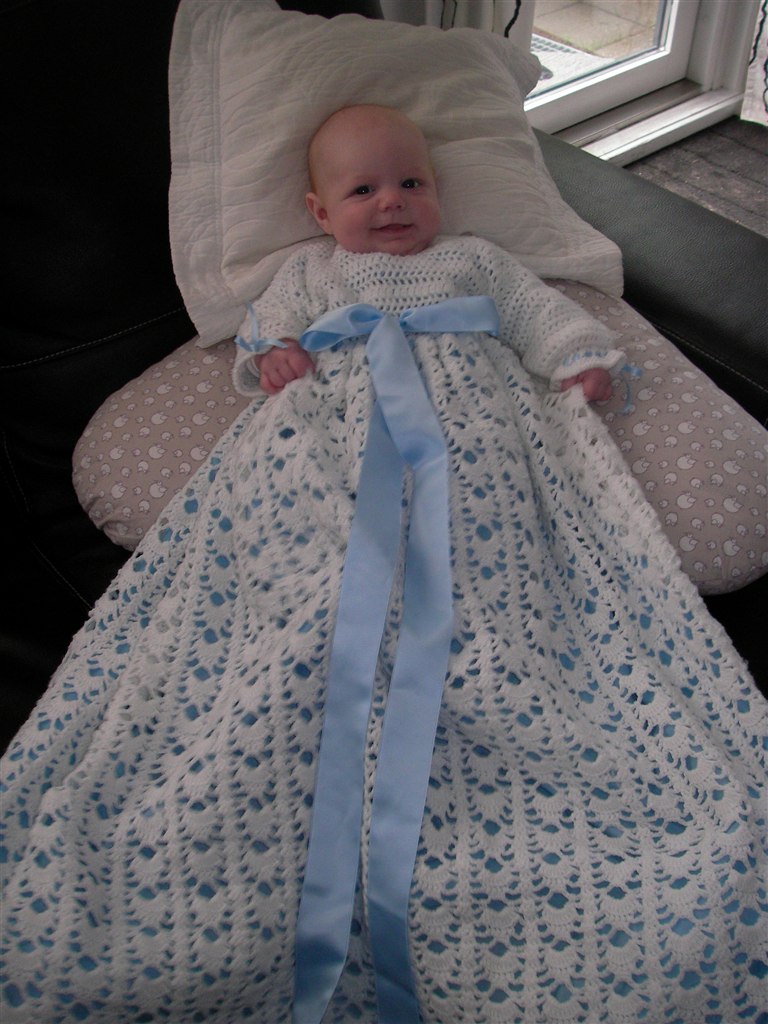 Her er vores søn Sebastian i en hjemmehæklet dåbskjole som er gået i generationer tilbage til 1987 og alle dem som er døbt i den har fået deres navne og dåbsdato skrevet på i bunden af kjolen (som man desværre ikke kan se på billedet)