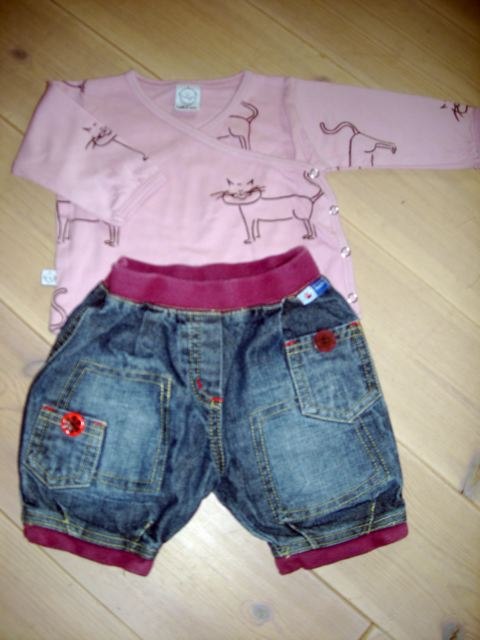 1+2. Str. 62.Slå-om bluse med katte fra Ida-t, og de fedeste denimbukser fra Molo, med smarte detaljer. Blusen er brugt og vasket 1 gang, bukserne er brugt mere, men er i superfin stand. 70 kr. for sættet.